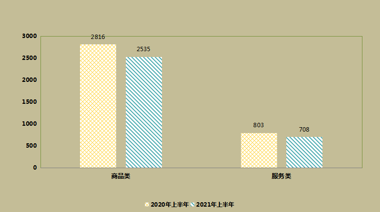 图二:2021年上半年全市12315系统受理消费者商品类和服务类投诉量图