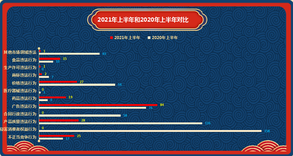 2021年上半年,全市市场监管系统共受理举报件202件,比上年同期减少了63%。其中广告违法行为84件,产品质量违法行为28件,价格违法行为27件,不正当竞争行为25件,药品违法行为19件,食品违法行为15件,商标违法行为2件,生产许可违法行为1件,其他市场领域违法行为1件。(详见图四)