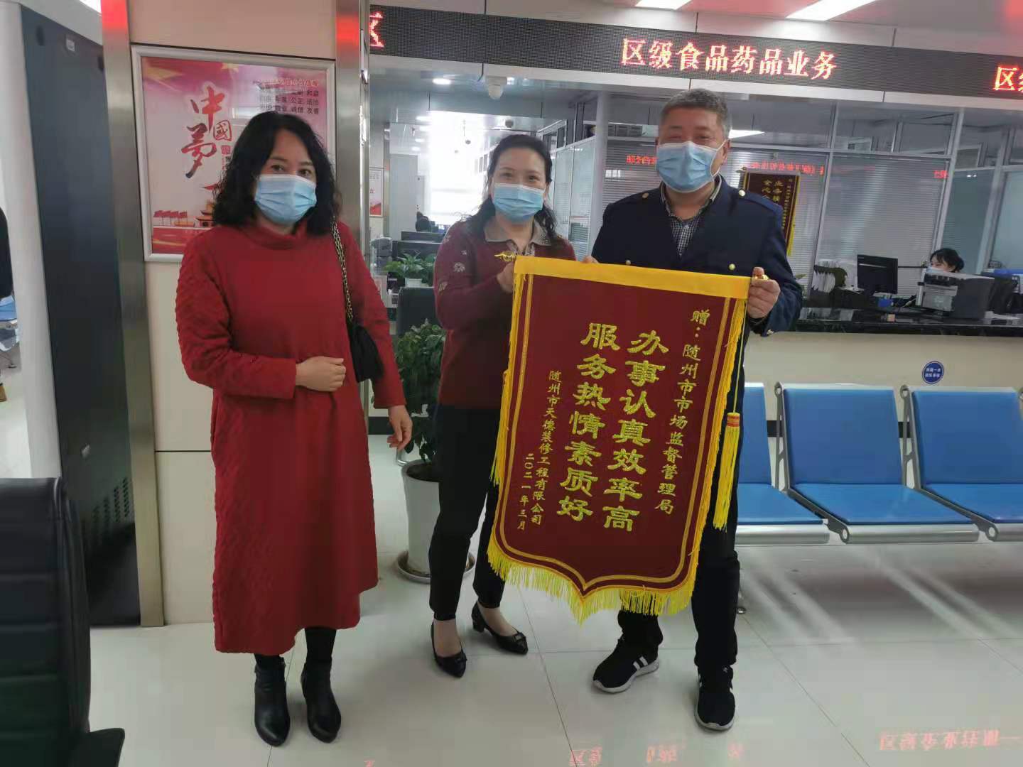 4月7日下午,随州市天德装修工程有限公司法定代表人张女士送来锦旗,感谢在营业执照办理过程中随州市市场监管局工作人员的热情服务,高效工作,为企业节省了大量时间,提升了办事体验。据悉,该企业是前来办理变更登记业务,因经营范围扩大,涉及多项后置行政许可,登记注册和行政审批窗口工作人员耐心为其一一讲解,从名称更改再到经营范围变更,一次性告知,顺利为其发放最新的营业执照。